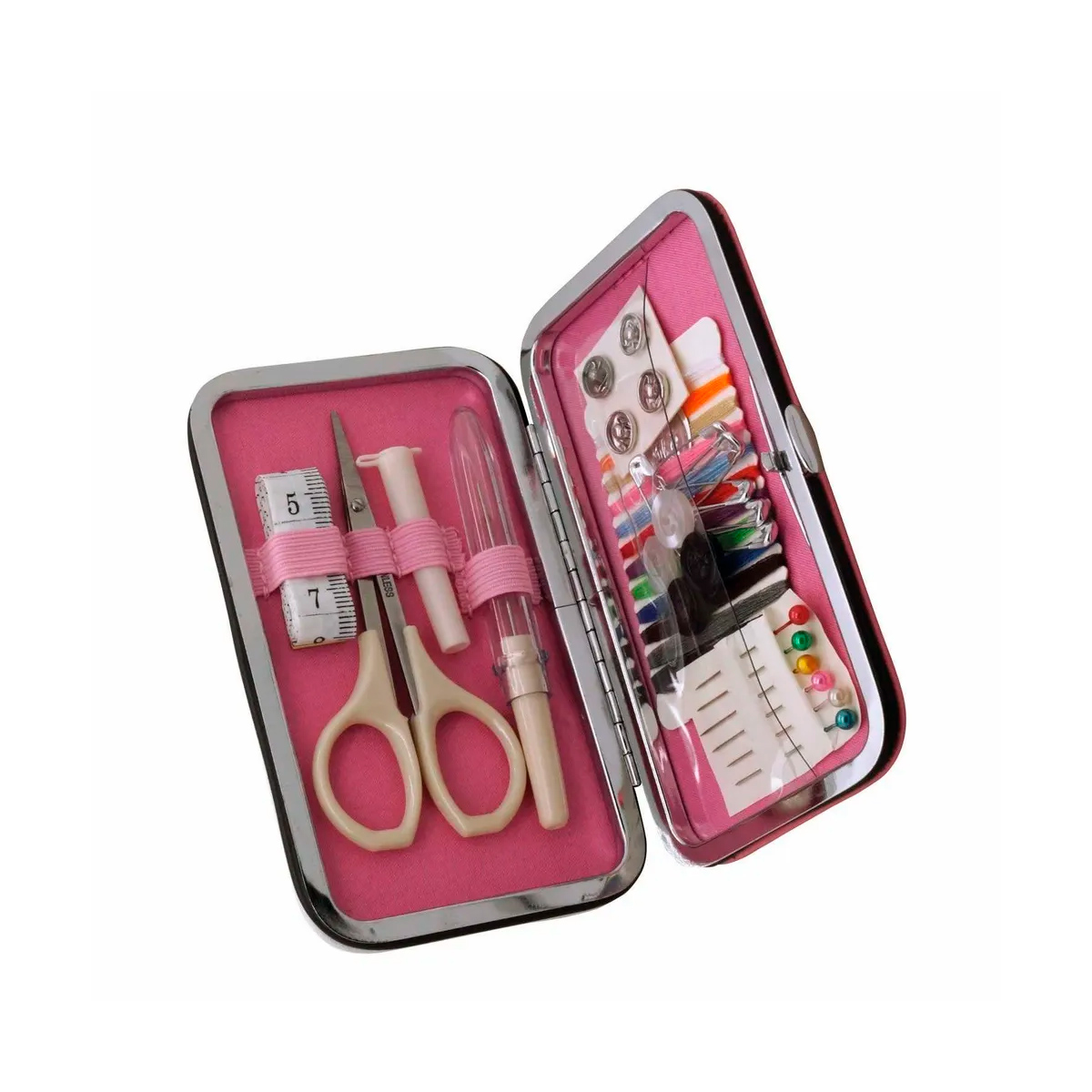 Набор для шитья, для путешествий, в металлической коробке 12*7*1,5см (в наборе: ножницы, вспарыватель, измерительная лента 150см, кнопки – 4шт, пуговицы для рубашки, нитки швейные, булавки с жемчужными головками – 6шт, иглы швейные в футляре – 3шт, булавки английские – 6шт), светло-розовый