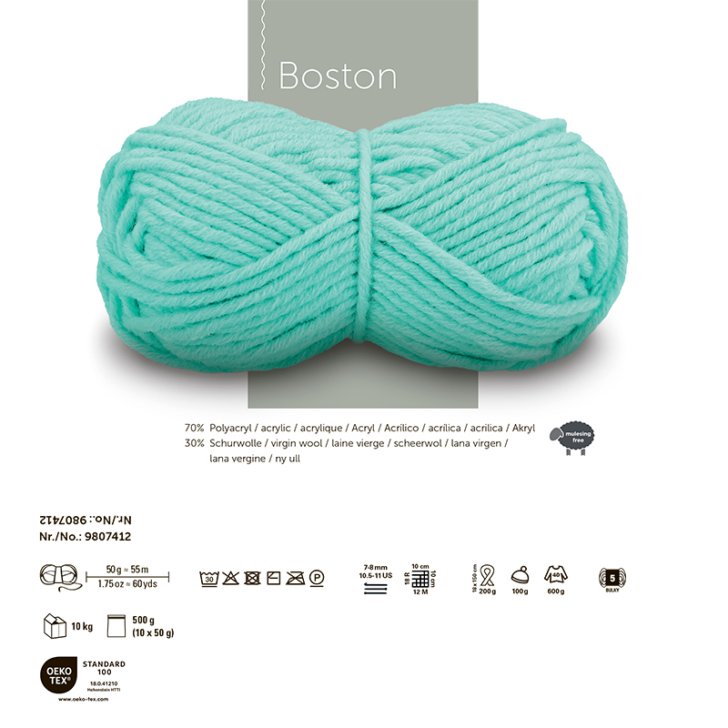 BOSTON— это пряжа от немецкого бренда Schachenmayr, известного своей высококачественной пряжей для вязания и рукоделия. Пряжа BOSTON состоит из 24 тонких нитей. Она представлена в широком спектре модных и классических оттенков. Благодаря четкому рисунку, Boston идеально подходит для создания структурированных узоров. Из нее можно связать шапки, шарфы, свитеры и куртки. Работа с этой пряжей проста и удобна. Для вязания подойдут спицы 7-8 мм. Процесс создания изделия проходит быстро и легко. При этом расход материала минимален. Пряжа Boston проста в уходе, вязаные вещи из нее можно стирать в стиральной машине не более 30 градусов. Изготовлена в Турции. Для изделия размера M потребуется 600 грамм пряжи. Рекомендуемые спицы: номер 7-8 мм