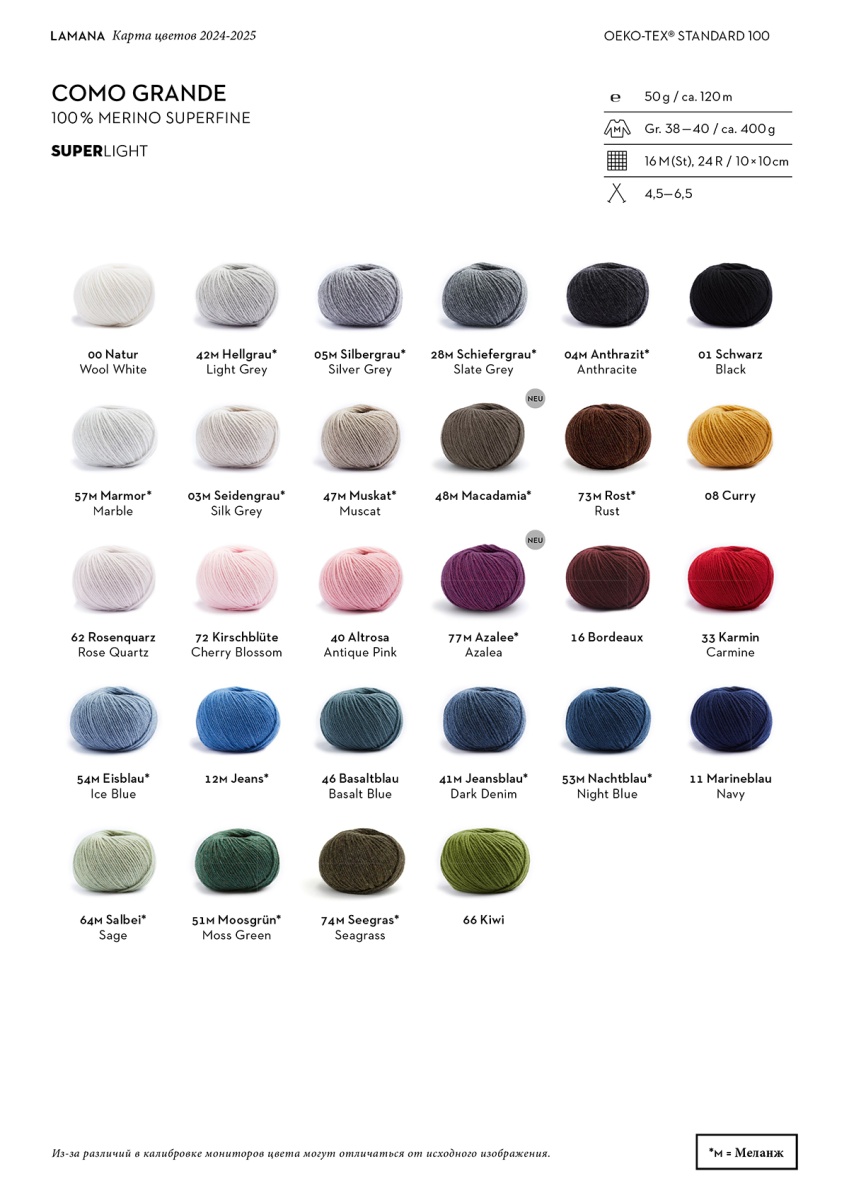 Пряжа Lamana-это сочетание изысканных волокон и высокого мастерства. Коллекция LAMANA SUPERLIGHT – для легких как перышко трикотажных изделий. COMO GRANDE это разновидность Como, но в два раза толще. Шерсть мериноса с ее терморегулирующими и воздухопроницаемыми свойствами обеспечивает комфорт, а легкий пух придает изделиям благородную матовую текстуру. Como Grande легко вязать,особое внимание уделите текстуре и узорам кос. Вязаные изделия сохраняют форму благодаря эластичности, что делает их воздушными и удобными. Como Grande идеально подходит для одежды и аксессуаров, благодаря мягкости и возможности машинной стирки.Деликатно стирать Como Grande можно в машинке при 30°C в режиме для шерсти. После стирки пряжа становится мягче и пушистее. Используйте нейтральное мягкое средство для стирки без ферментов и смягчителей!!! Сушите аккуратно, избегая прямых солнечных лучей. Для вязания изделий размера М вам понадобится 400 грамм пряжи. Рекомендуемые спицы №4.5–6.5.