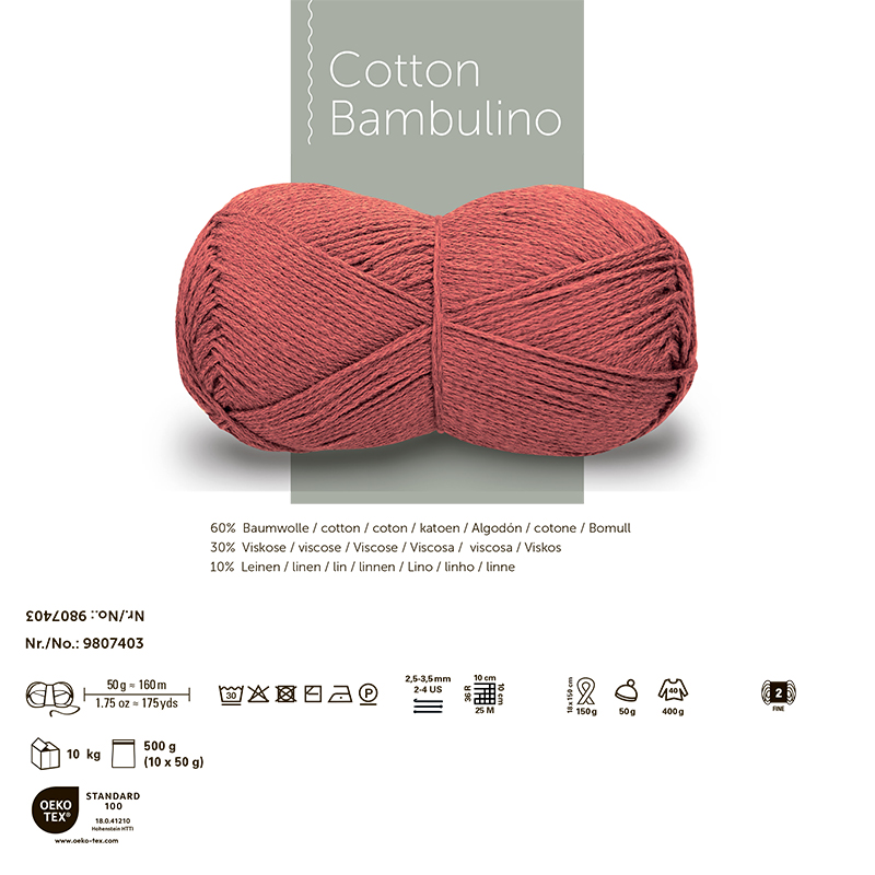 COTTON BAMBULINO — это пряжа от немецкого бренда Schachenmayr, известного своей высококачественной пряжей для вязания и рукоделия. Cotton Bambulino — идеальная летняя пряжа, сочетающая в себе натуральные материалы: мягкий хлопок, шелковистую вискозу (бамбук) и немного льна. Эти три летних волокна соединены в пряжу цепочкой, что придает изделиям элегантный и однородный вид даже при вязании гладью. Очаровательный ажурный узор и фактурные мотивы создают мягкие и женственные вещи. Благодаря большому метражу и ажурным узорам, изделия из Cotton Bambulino получаются легкими и летними. При этом фактурные детали создают нежные и женственные модели при минимальном расходе пряжи. Рекомендуется бережная стирка при температуре до 30 °C. Горизонтальная сушка в полутени. Для изделия размера M потребуется 400 граммов пряжи. Рекомендуемые спицы — номер 2,5–3,5 мм.