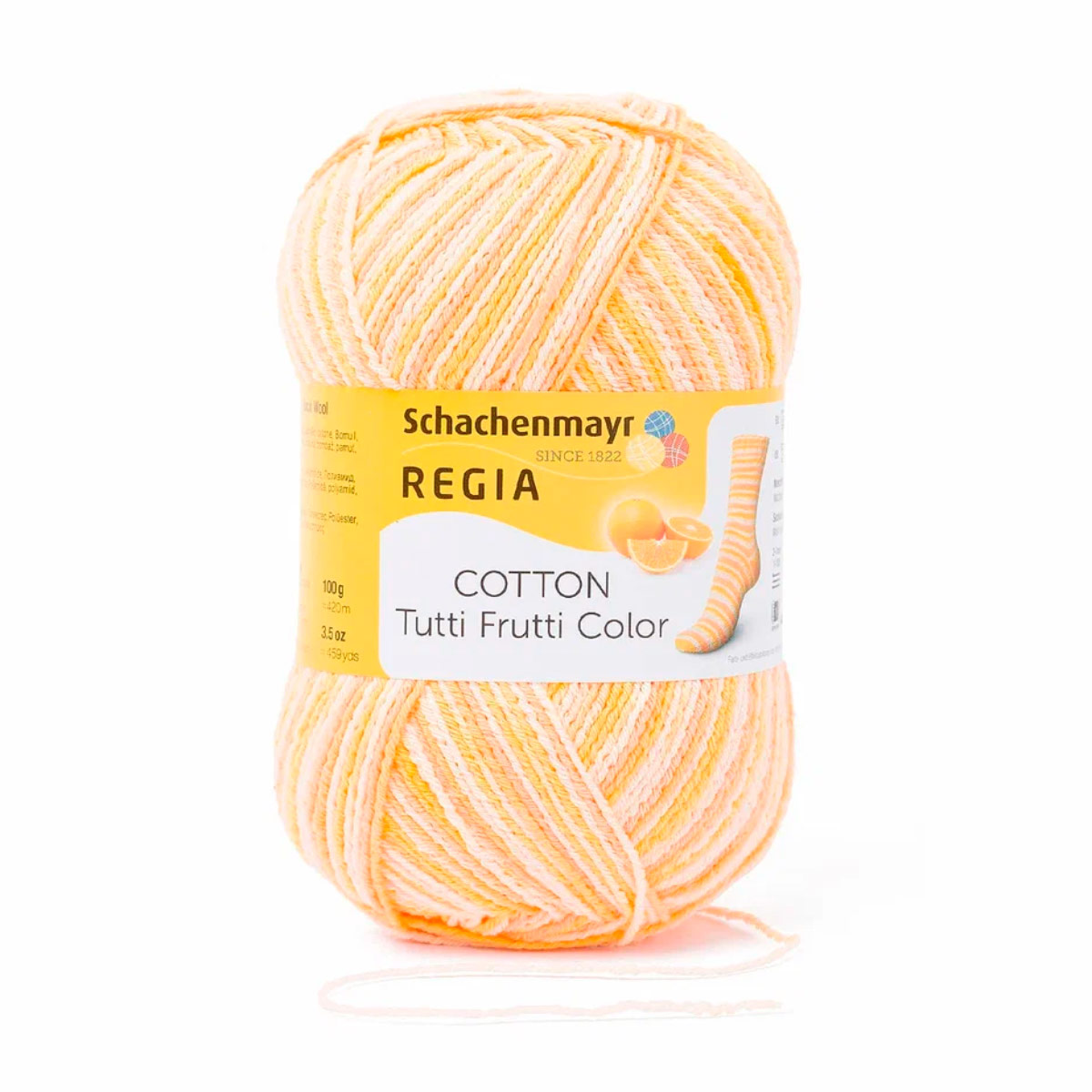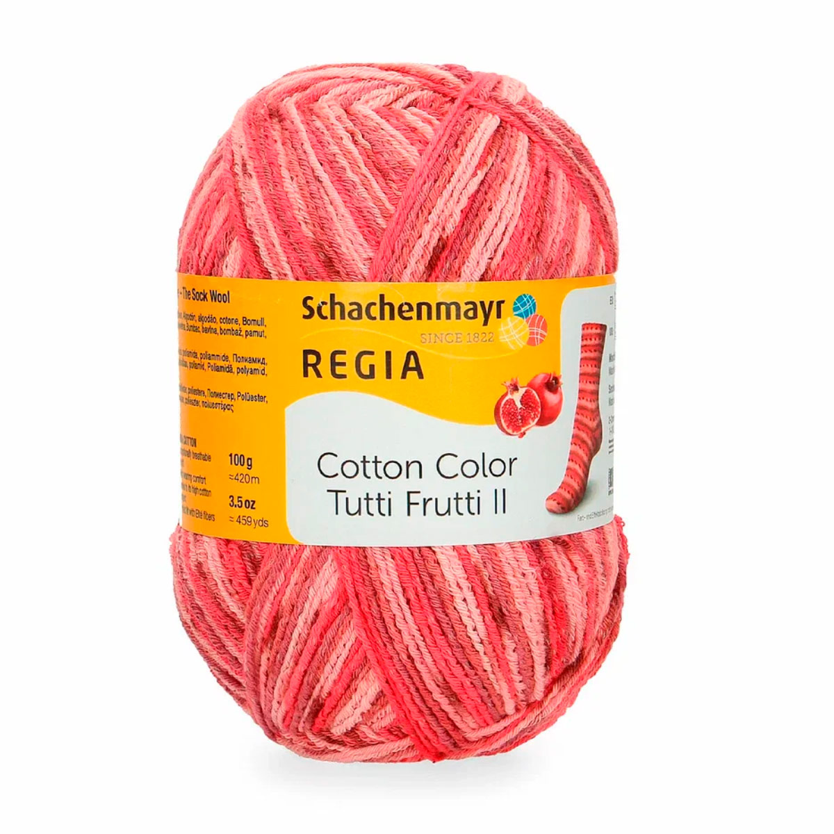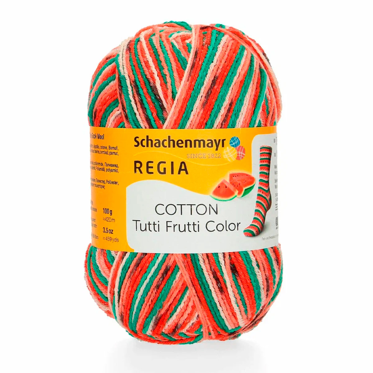 Regia Cotton Color - это популярная линейка хлопковой пряжи от немецкого бренда Regia, известного высоким качеством своих материалов для вязания. В составе пряжи - хлопок и полиэстер, что обеспечивает комфорт даже в теплую погоду. Хлопок делает ее дышащей и мягкой, а полиэстер добавляет эластичность.Серия Tutti Frutti с яркими, насыщенными оттенками напоминает фрукты и ягоды: клубнику, лимон, арбуз и виноград. Эта пряжа гладкая и приятная к телу, подходит для вязания вещей на любой сезон. Из нее можно связать яркие маечки, носочки и следки, которые будут радовать вас все лето..Одного мотка пряжи хватит на носки до 46 размера
