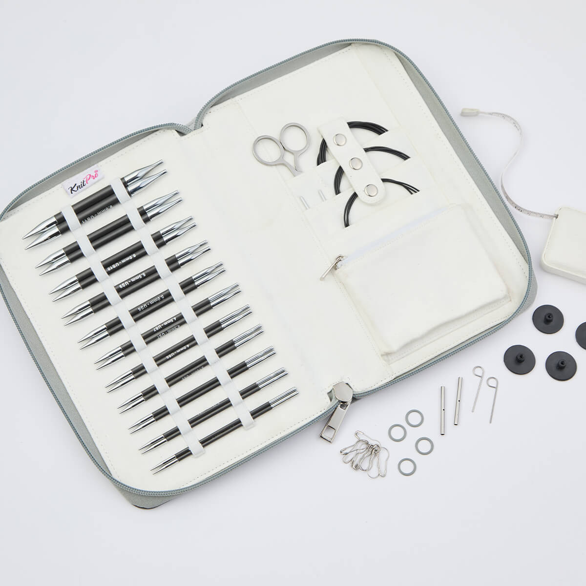 Набор "Regal" спиц съемных "Karbonz" (в наборе: сумочка с фестончатым краем – ткань тиси, спицы съемные 11 размеров (3мм, 3,25мм, 3,5мм, 3,75мм, 4мм, 4,5мм, 5мм, 5,5мм, 6мм, 6,5мм, 8мм, длина 13см) - карбон, тросик поворотный 5шт (60см - 2шт, 80см – 2шт, 100см) - нержавеющая сталь с нейлоновым покрытием, заглушки 8шт - пластик, ключик для тросика 4шт – металл, соединитель для тросиков 1 набор - сталь, ножницы, измерительная лента, игла для сшивания трикотажных изделий 2шт, маркеры для вязания «Булавка» 10шт, маркеры для вязания «Круг» 10шт), черный